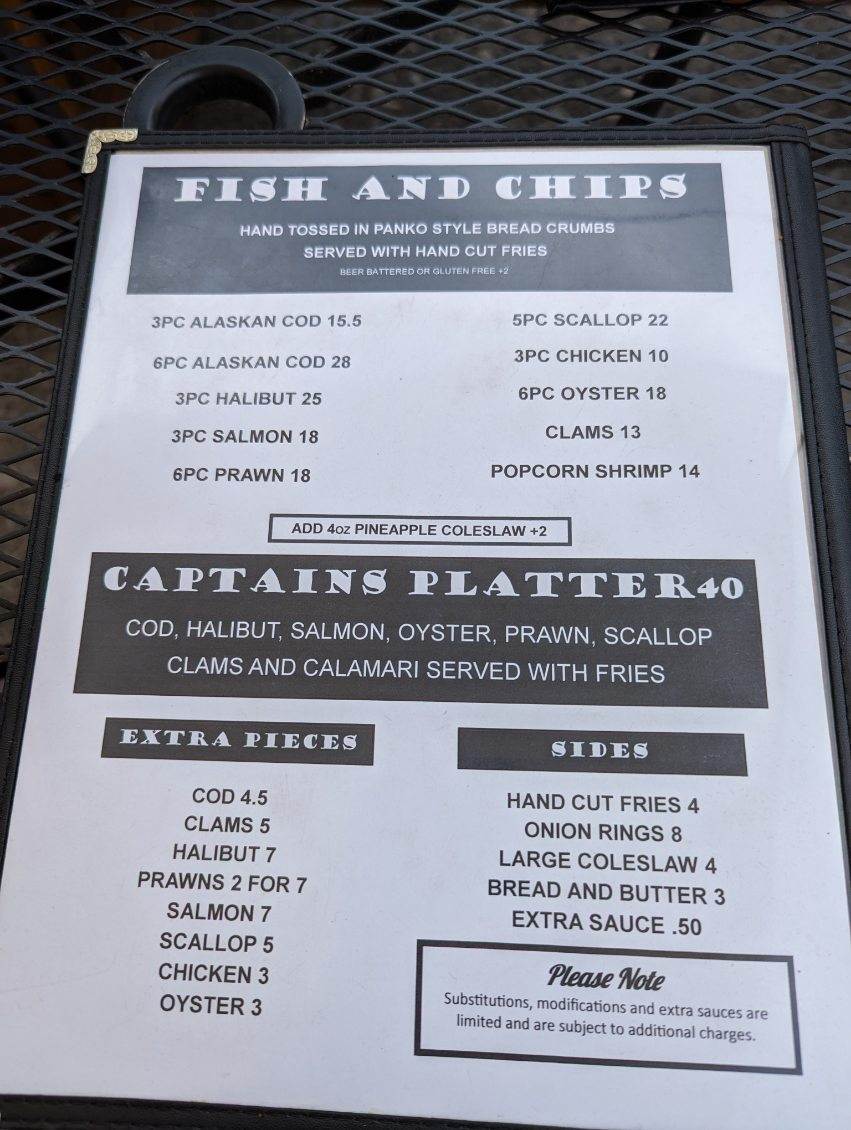 Cod, Halibut, Salmon, Oyster, Scallop, Prawn, Clams and Calamari served with Fries. *only cod, halibut, salmon, prawns and scallops can be beer battered* Served with Tarter and Cocktail sauce
